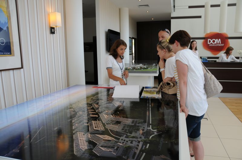 Jednak ci, którzy przybyli, aby zapoznać się z warunkami sprzedaży i cenami, jak też uzyskaniem konkretnych informacji o terminach i sumach opłaty kierowali się bezpośrednio do biura sprzedaży mieszkań, znajdującym się tuż na miejscu, przy Placu Zamkowym. Przyjemny chłodek, panujący w biurze, miła obsługa pań, udzielających wyczerpujących odpowiedzi zatrzymywały klientów na dłużej.