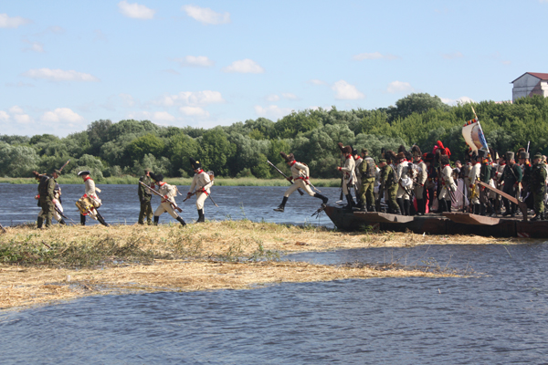 Odtwarzając historyczne wydarzenia, zadbano również o ten szczegół — początkowo dwie łodzie wypełnione piechurami przybiły do wschodniego brzegu Niemna, a następnie ruszyła armia. Co prawda, nie stawiano już mostów pontonowych, zastąpił je pontonowy prom, który dopiero za trzecim rejsem przeprawił przez Niemen wszystkich żołnierzy. Rozkazy w językach francuskim, polskim, łotewskim i litewskim mówiły o pochodzeniu żołnierzy, a słowiański akcent w komendach niemieckich zdradził Czechów odtwarzających pułki austriackie. Tak samo, jak przed 200 laty, przeprawa obeszła się bez strat, najwyżej któryś z uczestników przemoczył nogi.