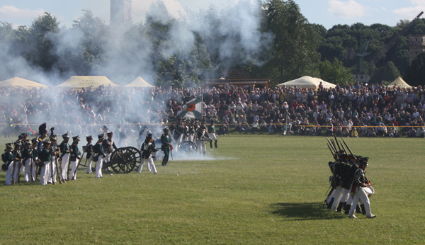 Rekonstruując bitwę, postarano się przekazać sposób walki tamtej epoki. Blisko godzinę trwały zmagania — nacierała raz jedna strona, raz druga, grzmiały armaty, a szarże kawalerii zmuszały piechotę ustawiać się w czworoboki. Komentator jednak wyraźnie był po stronie Napoleona, częściej zachęcając do oklasków skierowanych Francuzom i w tym wypadku historię nieco zmieniono, kończąc batalię całkowitym rozbiciem Rosjan. Oczywiście zbliżająca się noc świętojańska, zabawy i koncerty pogodziły wszystkich.