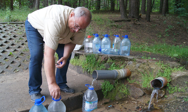 Pan Michał przy źródle dworczańskim (a tu spotkaliśmy naszych rozmówców) jest raz tygodniowo. W zasadzie — w sobotę, kiedy wraca z ogrodu, który jest w okolicach Nowej Wilejki. Cieszy się, kiedy nie musi wystawać w kolejce, bo podobnych jemu zaopatrujących się w wodę źródlana jest sporo. Przywożą po pięć, dziesięć pojemników — czasami po dziesięć litrów. Więc dopóki jeden zapełni — trzeba wystawać czasami godzinę w kolejce. Ale, ma potem wody na tydzień — czyli z kranu używa tylko do kąpania. Bo źródlana jest stale w kuchni. Z niej nie tylko herbatę zaparza, ale też zupy, kompoty gotuje, bo, jak mówi, i osad na garnkach się nie tworzy, a smak potrawy jest lepszy.