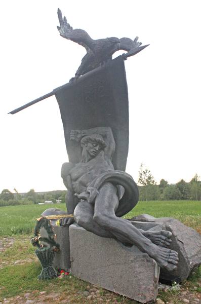Dostaliśmy się w okolicę wsi Bryli, gdzie jeszcze za czasów carskiej Rosji, w rocznicę bitwy w 1912 r. ustawiono pomnik zwieńczony carskim dwugłowym orłem. Znienawidzony przez bolszewików symbol „starego reżymu” stał się powodem do zniszczenia pomnika już w 1920 r. Miejsce jednak znane było z podręczników, więc w czasach breżniewowskich postanowiono uhonorować nowym monumentem, którego masywna metalowa bryła zachowała się, pomimo że wokół rozrosły się krzaki. Nieukończony pomnik nawiązuje do ideologii z okresu swego wykonania – płask orzeźba przedstawia pogromców „napoleońskich zachwatczikow”: pięciu żołnierzy-wiarusów w kaszkietach i pod sumiastym wąsem, kozaka w papasze, parę brodatych nachmurzonych chłopów z siekierą i widłami oraz babę w chuście o spojrzeniu przypominającym rewolucjonistkę z 1917 roku. Taki pomnik miał podkreślać „rolę zwykłego ludu w wojnie ojczyźnianej”. Czas złagodził antagonizmy i obecnie są dwa – odbudowany w 1992 r. z orłem o dwu głowach oraz kryjący się za zielenią „z woli ludu pracy”. Dzień powszedni, żadnej rocznicy czy uroczystości, lecz co jakiś czas dojeżdżało jakieś auto, zawsze kręciła się grupka zwiedzających. Miejsce jest znane i uczęszczane.