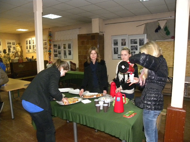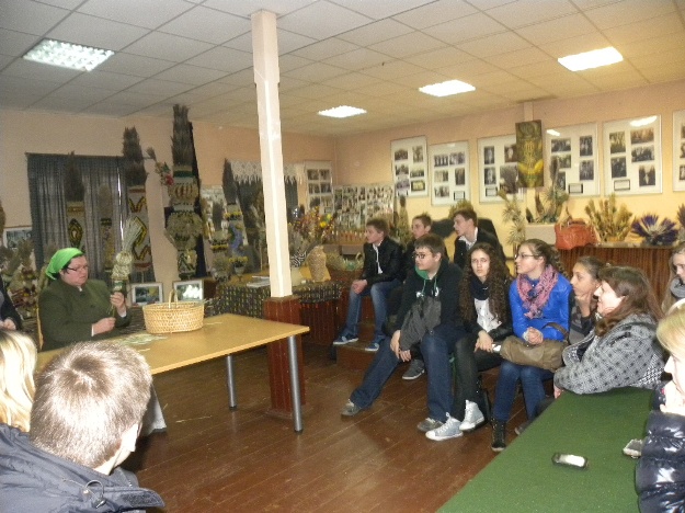 Po prezentacji projektu uczestnicy z obu szkół razem z gośćmi udali się do Izby Palm i Użytku Codziennego” w Ciechanowiszkach, gdzie odbyło się pokazowe zajęcie edukacyjne „Wicie palm”. Tekst z języka polskiego na angielski tłumaczył uczeń Mirosław Michalkiewicz. Zajęcie przeprowadziła kierowniczka izby Pani Janina Norkūnienė oraz twórczyni ludowa Pani Teresa Michalkiewicz.