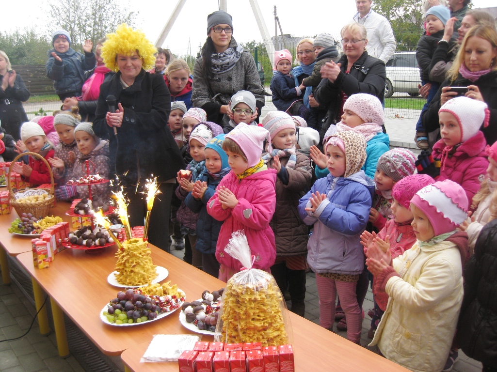 Pierwszy rok pracy żłobka-przedszkola podsumowano podczas Święta Plonów na świeżym powietrzu, tuż przy wejściu do budynku przedszkolnego, z udziałem rodziców, babć, dziadków, dzieci oraz pracowników przedszkola. Ten uroczysty dzień nie obył się bez serdecznych podziękowań dla nauczycieli i wychowawców za ogromny wysiłek dydaktyczny, wkładany w wychowanie najmłodszego pokolenia, za serce, uśmiech, cierpliwość w tej trudnej misji. Administracji i obsłudze dziękowano za przykładne wykonywanie swoich obowiązków, za współpracę, zaangażowanie i poświęcenie na rzecz tworzenia niepowtarzalnego wizerunku przedszkola. Ta pierwsza rocznica pozostawiła niekłamane uczucia radości i chęć jeszcze lepszego wypełniania misji służenia dzieciom. Wspólnymi siłami, na piękną okazję 1 rocznicy przedszkola oraz Święta Plonów, na łonie natury utworzona została niebywale pomysłowa kompozycja.