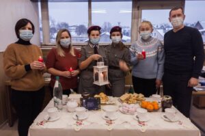 Odpaliliśmy od Światełka Pokoju świece, po czym wykonaliśmy pamiątkowe zdjęcie. Usiedliśmy przy herbacie i ciastkach, żeby trochę porozmawiać. I porozmawialiśmy! Pani Halina, łamaczka „Kuriera Wileńskiego” opowiedziała o czasach, gdy jeszcze gazetę składało się na linotypie ołowianymi czcionkami. Pan Damian, również łamacz i drukarz, podzielił się swoimi przygodami i pasją do podróży (lądował na łamach „Kuriera” opowiadając o bliskości z przyrodą i rajdach rowerowych). Pani Jola i pani Janka jednogłosem wyraziły sceptycyzm wobec Damianowych pomysłów noclegu w lesie, wśród wilków.