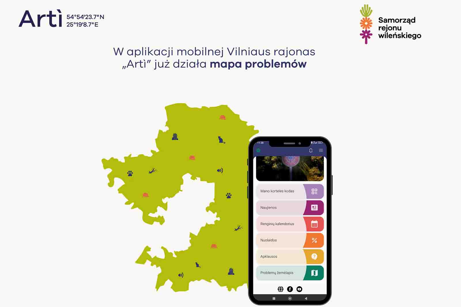 Aplikacja mobilna Vilniaus rajonas „Artì” jest częścią cyfrowego programu karty mieszkańca rejonu wileńskiego – można w niej znaleźć unikalny kod QR karty mieszkańca (umożliwiający skorzystanie ze zniżek partnerów programu), wiadomości samorządu, kalendarz wydarzeń, informacje o zniżkach, moduł ankiet, a od teraz – również mapę problemów.