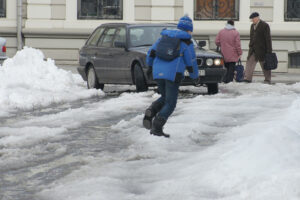 „Wiele osób zapewne wie, że idąc po śliskiej nawierzchni, należy naśladować chód pingwina, czyli poruszać się powoli, małymi krokami, minimalnie lub w ogóle nie odrywając stóp od ziemi. Należy starać się od razu stawiać całą stopę, a palce lekko skierować na zewnątrz. Szybciej zareagujesz na poślizg, jeśli kolana będą lekko ugięte” — mówi Laimonas Uščinas.